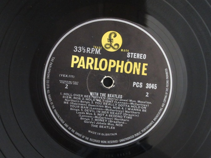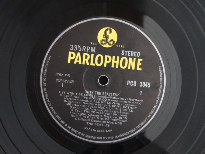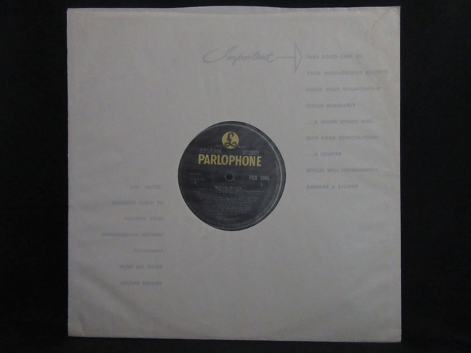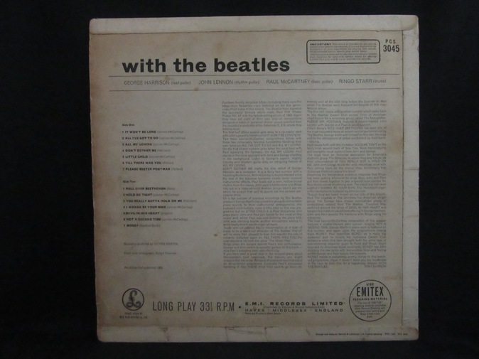 Dick Jamesクレジットの初盤。インナー付き。ビートルズのオリジナルプレスの中で最も荒々しい音が聞ける一枚。世に出た最初の彼らのLPレコード。裏ジャケットフリップバック上部に傷みがあります。裏ジャケットに名前の書き込みがあります。B-2とB-3で前方への針飛びが1回ずつあります。それ以外は針飛び無くまともな音で再生できます。レーベルの発色はきれいです。右下の「Angus McBean」が右寄りの初版ジャケット。マザ−・スタンバーは1 GO/1 Hです。そんなに悪くないですが、念のためジャンク品とお考え下さい。マトリックスは 421-1N,422-1N です。PIC1 PIC2 PIC3 PIC4 PIC5 PIC6 PIC7 Sold |