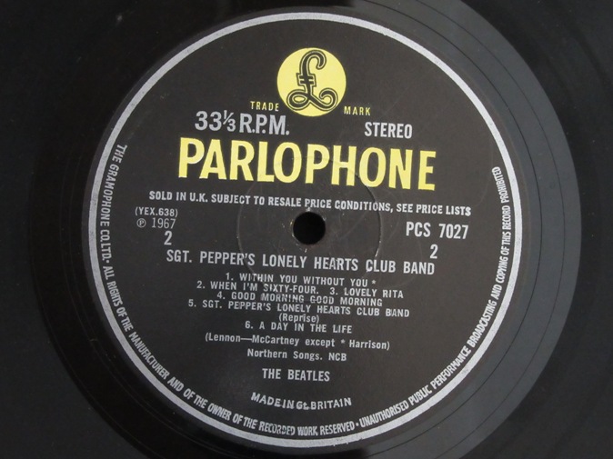 | ◆ LP BEATLES / SGT. Pepper's Lonely Hearts Club Band (UK Y/B Parlophone stereo) Ex-/Vg++ 12800円(内税) SOLD IN U.K.レーベル表示。オリジナル見開きジャケ。切り抜きインサート付き。プレインホワイトインナー。ファーストプレス。Who's Who インサートのコピーがおまけで付きます。メタルマザー、スタンパーは 3 GOG/2 GOD です。盤面薄いスレありますが、針飛び無く良い音で再生できます。マトリックスは 637-1,638-1 です。PIC1 PIC2 PIC3 PIC4 PIC5 PIC6 PIC7 | |