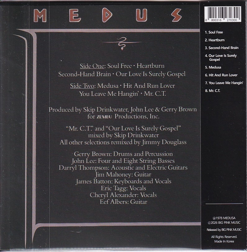 ![]() | ◆ CD Medusa / S/T (BIGPINK Bigpink1013) 2400円(内税) (アーティストの母国:米国 商品の原産国:韓国) 米国産ジャズロック・バンド、78年唯一作。ハードポップAOR、プログレッシヴなシティファンクなど多彩な楽曲。PIC1 PIC2 |