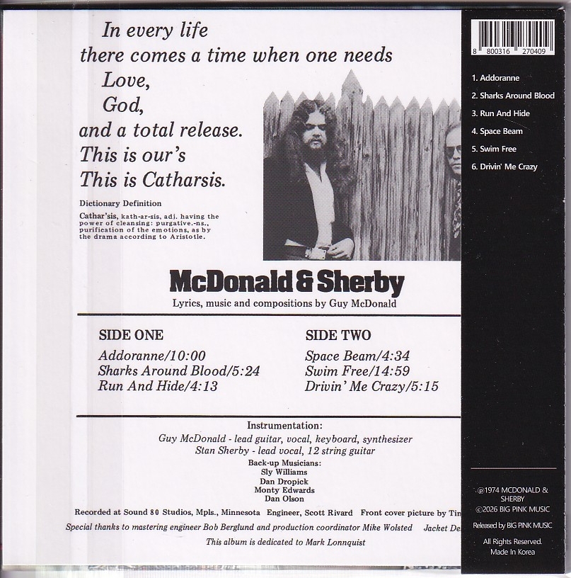 ![]() | ◆ CD McDonald & Sherby / Catharsis (BIGPINK Bigpink1019) 2400円(内税) (アーティストの母国:米国 商品の原産国:韓国) ミネアポリス産ハード/サイケ・デュオ、69年唯一作。ファズ・ギター、オルガン、シンセ、パーカッションをフューチャーしたアシッド感満載のハード/サイケデリック・ロック・サウンド。10分を超える長尺ナンバーが2曲が聴き所。紙ジャケット仕様。PIC1 PIC2 |