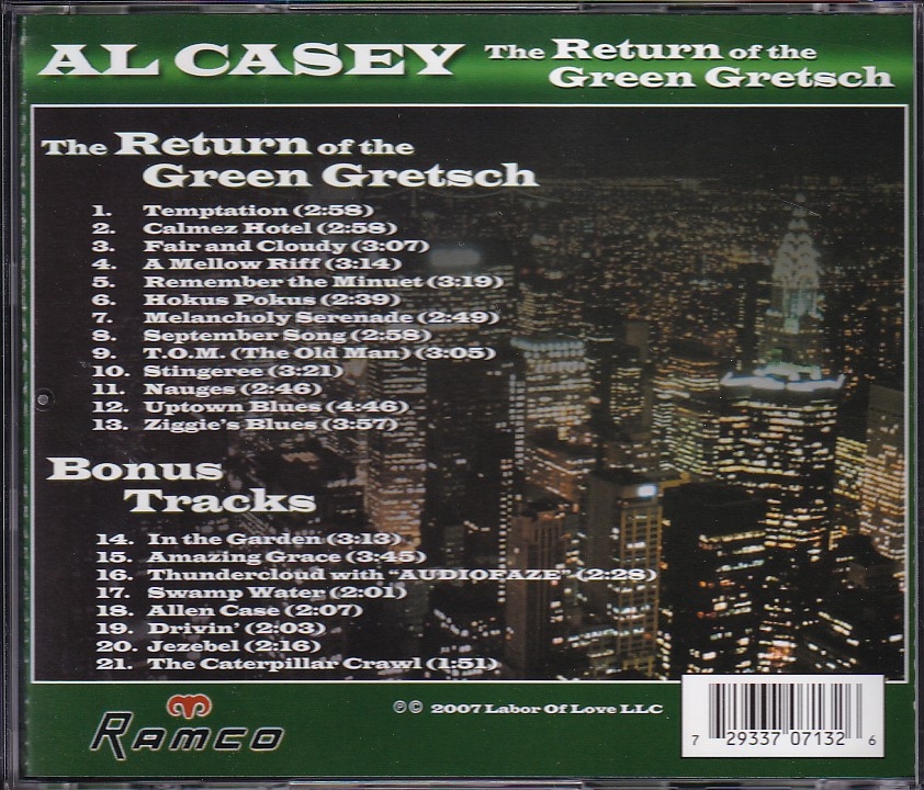 ![]() | ◆ CD AL CASEY / The Return of The Green Gretsch (Ramco RAMCO CD 713) 2450円(内税) (アーティストの母国:米国 商品の原産国:米国) 米国人ギタリスト、2006年ラスト・アルバム。遺産にふさわしい集大成。過去に行われた地元セッションからの4曲と、ラムコのアーカイブ深くに眠っていた5曲を追加収録。PIC1 PIC2 |