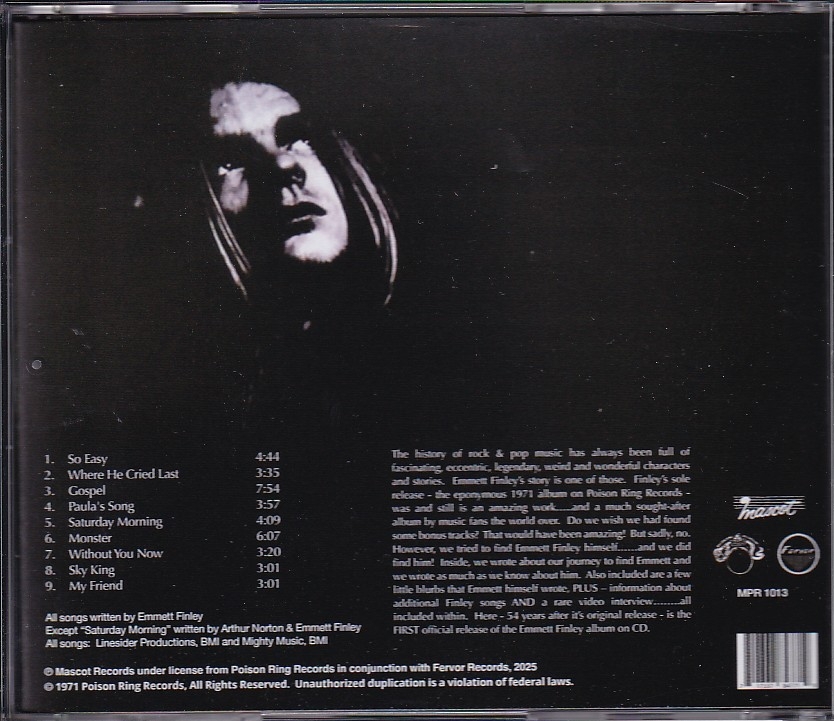 ![]() | ◆ CD EMMETT FINLEY / S/T (MASCOT RECORDS MPR 1013) 3150円(内税) (アーティストの母国:米国 商品の原産国:米国) 謎多きSSW、71年唯一作。美しいメロディが印象的なサイケ/フォークロック・サウンド。PIC1 PIC2 |