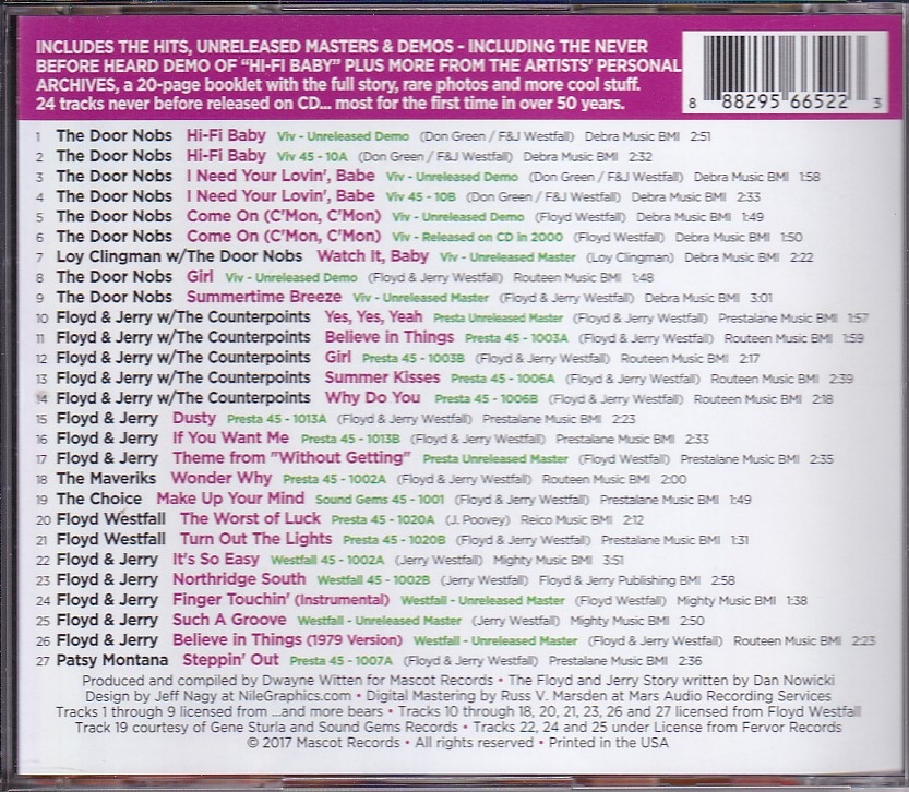 ![]() | ◆ CD FLOYD & JERRY WESTFALL / Hi-Fi Baby: Floyd & Jerry Story (MASCOT RECORDS M1003) 1750円(内税) (アーティストの母国:米国 商品の原産国:米国) 全27曲。ヒット曲『Believe in Things』『Summer Kisses』『Dusty』をはじめ、未発表デモ音源、未公開マスター音源、フロイド&ジェリーが他アーティストのために書いた楽曲まで網羅。20ページのブックレット付き。PIC1 PIC2 |