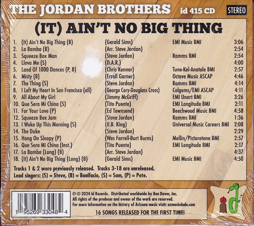 ![]() | ◆ CD JORDAN BROTHERS featuring STEVE JORDAN / (It) Ain't No Big Thing (ID Records id415CD) 2850円(内税) (アーティストの母国:米国 商品の原産国:米国) フェニックス産60年代チカーノ貴重音源。ボタン式アコーディオンを独自に改造し、フェイズシフター、エコープレックス、ファズボックスを駆使。ジャズ、ロック、サルサ、ブルース、マンボ、カントリー、テハノ、ザイデコなどあらゆる音楽スタイルを吸収。18曲のソウル&ラティーノ楽曲。内、16曲はほぼ60年ぶりの初公開音源。デジパック仕様。PIC1 PIC2 |