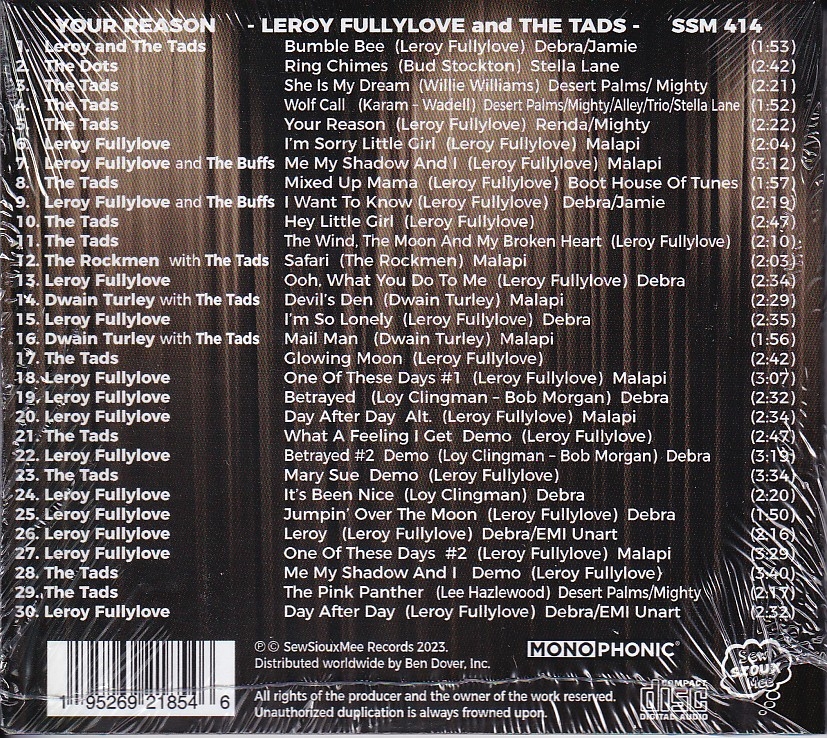 ![]() | ◆ CD LEROY FULLY LOVE & THE TADS / Your Reason (SewSiouxMee Records SSM414) 2650円(内税) (アーティストの母国:米国 商品の原産国:米国) 非常に希少な(1956-1962年)アリゾナ州録音。フルーラヴのソロ録音に加え、ザ・タッズ、ザ・バフス、ザ・ドッツによる楽曲、そしてバックコーラスとしての彼らのレコードも収録。デジタルマスタリング。素晴らしいグループハーモニーを堪能できる30曲(未発表曲多数)を詰め込んだ傑作。デジパック仕様で16ページのフルカラーブックレット付属。PIC1 PIC2 |