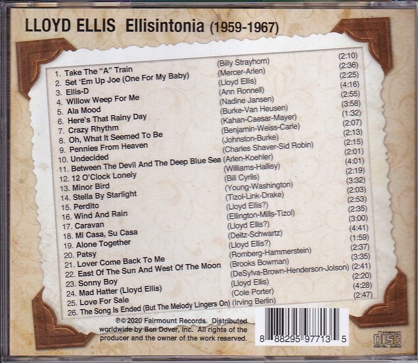 ![]() | ◆ CD LLOYD ELLIS / Ellisintonia (Fairmont Records Fairmont CD3881) 2850円(内税) (アーティストの母国:米国 商品の原産国:米国) アメリカ人ジャズギタリスト兼作曲家、アリゾナ州フェニックスのオーディオ・レコーダーズ社アーカイブから発掘された26曲(未発表曲多数)。1959年から67年にかけてジャック・ミラーとデイブ・オックスマンが録音した、アメリカン・ソングブックの名曲の数々とエリス自身のオリジナル曲の数々が収録されている。PIC1 PIC2 |