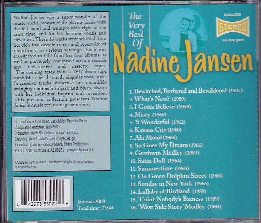 ![]() | ◆ CD NADINE JANSEN / The Very Best of (Jantone Records Jantone 2009) 2350円(内税) (アーティストの母国:米国 商品の原産国:米国) アメリカ人ピアニスト、ボーカリスト、トランペット奏者、フリューゲルホルン奏者、そしてソングライター。フェニックスを拠点とするジャントーン・レコードのオーナーでもあった。16曲を収録した優れたジャズ/ラウンジ・アルバム。PIC1 PIC2 |