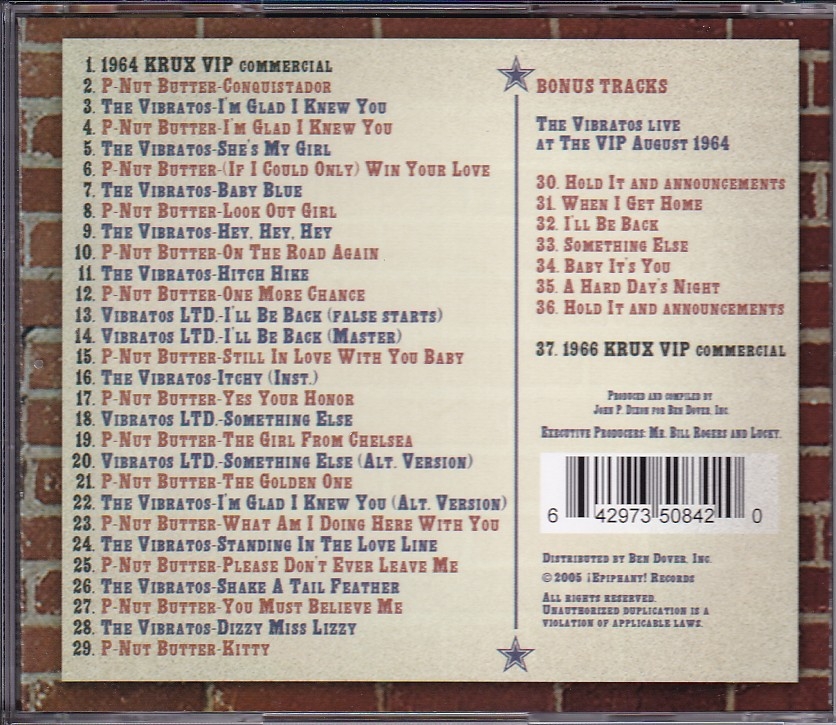 ![]() | ◆ CD P-NUT BUTTER/THE VIBRATOS / VIP Club Presents: Battle of the Bands (MASCOT RECORDS M1001) 2150円(内税) (アーティストの母国:米国 商品の原産国:米国) 1960年代アリゾナを代表する二大ローカルバンド、P-NUT BUTTERとTHE VIBRATOSによる傑作コンピレーション。ボーナスとして、1964年8月にVIPで録音された、ザ・ヴァイブラトスによる5曲のビートルズのライブセットも収録されています。詳細なライナーノーツと多くの写真、そしてKRUXのコマーシャルも数本収録されています。PIC1 PIC2 |
