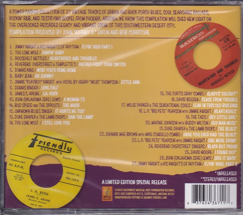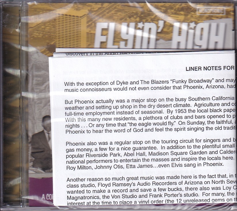 ![]() | ◆ CD VARIOUS / Flyin' High: A Collection of Phoenix Blues (SWMAF Records SWMAF 07) 2350円(内税) (アーティストの母国:米国 商品の原産国:米国) アリゾナ州フェニックス産、27曲のヴィンテージ・トラックを詰め込んだパワフルなコレクション。50〜60年代フェニックスの魂が込められた音楽を網羅。当時の代表的なサウンドを生み出したジミー・ナイトは、揺れるような低音サックスとロックンロール調のスタイルで、フェニックス・ブルースのジャンルを確立した人物。その他、L.P. ビッグ・ピート、ザ・カーティス・グレイ・コンボ、ザ・タッズ、デューク・ドレイパー&ザ・ラム・チョップスなどを網羅した史上最高のコンピレーション盤の一つ。PIC1 PIC2 |