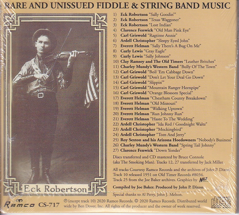 ![]() | ◆ CD VARIOUS / Rare & Unissued Fiddle & String Band Music (Ramco CS-717) 2150円(内税) (アーティストの母国:米国 商品の原産国:米国) 素晴らしいヴィンテージ・アリゾナ・ミュージック。エック・ロバートソン、カーリー・ルイス、カール・グリスウォルド、エヴェレット・ホルマン、アーデル・クリストファーなどのアーティストが参加。ジョー・ベイカーによる情報満載のライナーノーツも収録。27曲。紙ジャケット仕様。PIC1 PIC2 |