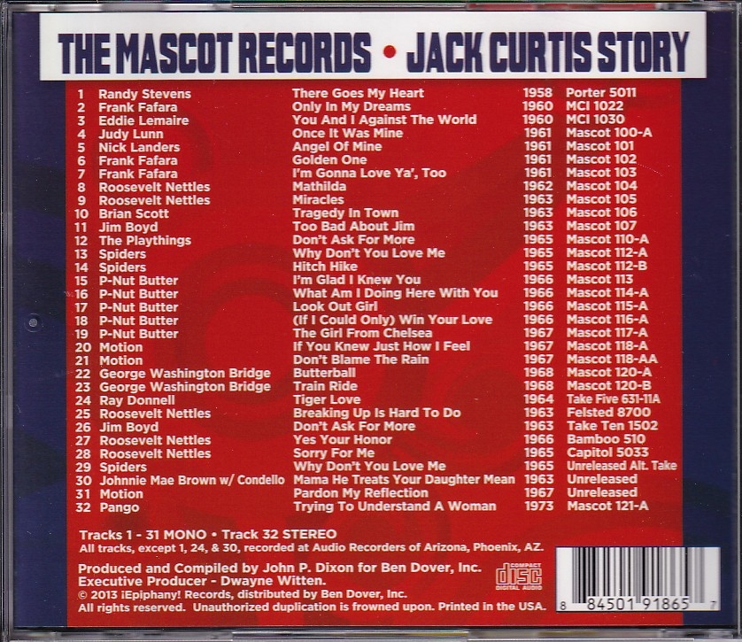 ![]() | ◆ CD VARIOUS / The Mascot Records/Jack Curtis Story (MASCOT RECORDS M1002) 2150円(内税) (アーティストの母国:米国 商品の原産国:米国) 1959年から1973年までの未発表曲を含む32曲を収録。ロカビリー、R&B、ティーンアイドルサウンドから、ガレージロック、サイケデリック、サンシャインポップまで、幅広い音楽ジャンルを網羅。スパイダーズ(アリス・クーパー結成前)の最初のシングル(1965年)の両面、そして「Why Don't You Love Me」の別テイクなどレア音源も収録。24ページのブックレットが付属しており、ダン・ノウィッキによる詳細なライナーノーツが掲載されています。PIC1 PIC2 |