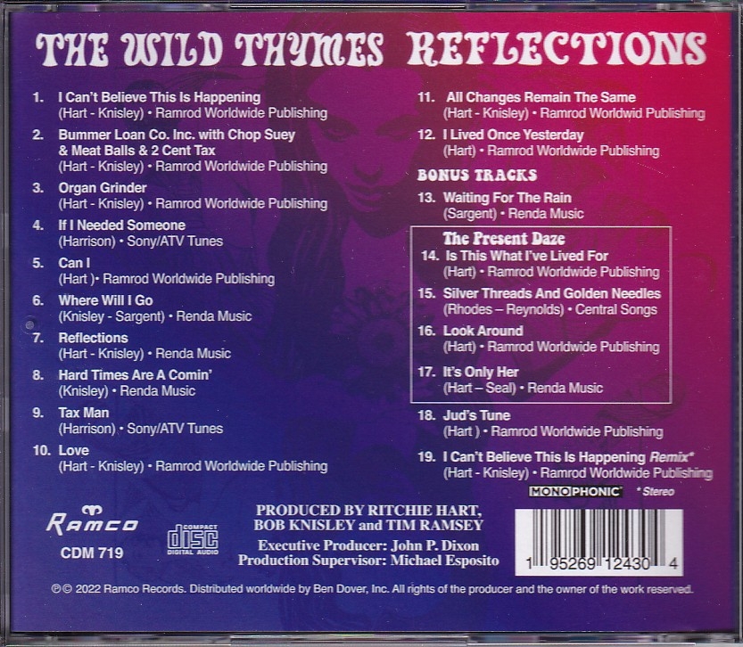 ![]() | ◆ CD WILD THYMES / Reflections (Ramco CDM719) 2850円(内税) (アーティストの母国:米国 商品の原産国:米国) 短命な60年代スタジオ創作バンド。驚異的なポップ・サイケ/ファズ・ガレージ・サウンド。メンバーは、リッチー・ハート(ギター&ボーカル)、ボブ・ニズリー(ギター)、リッチー・メッツェンドルフ(ベース)、デニス・ケンモア(ドラムス)。さらにマイク・コンデロ(ギター&ボーカル)、レイ・トレイナー(ベース&オルガン)、スティーブ・フォーマン(パーカッション)が参加した。ライナーノーツはグラミー賞ノミネート歴のある音楽史家アレック・パローが執筆。PIC1 PIC2 |