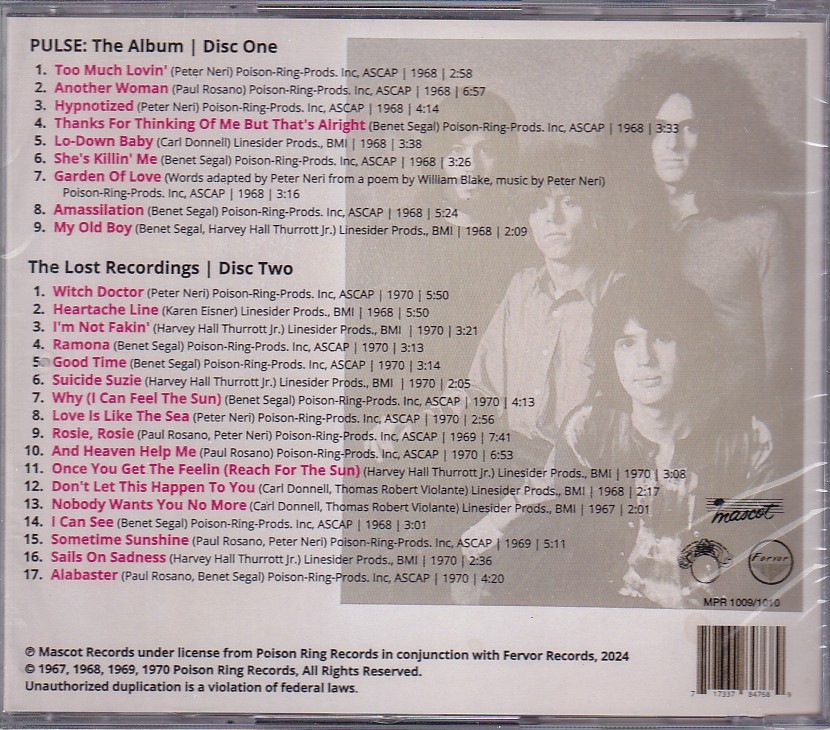 ![]() | ◆ 2CD PULSE / The Album PLUS The Lost Recordings (MASCOT RECORDS MPR1009-1010) 4450円(内税) (アーティストの母国:米国 商品の原産国:米国) コネチカット産ガレージ・サイケ・バンド。ザ・シャッグスとブラム・リッグ・セットの後身。轟音のファジーなディストーション・リード、力強いボーカル、ハーモニカが満載。バンド唯一のアルバム収録9曲(CD初合法公認リリース)に加え、新たに発見された未発表曲17曲を収録。PIC1 PIC2 |