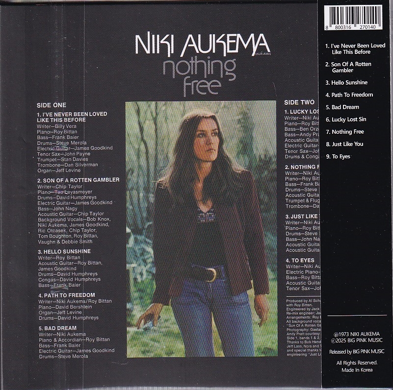 ![]() | ◆ CD Niki Aukema / Nothing Free (BIGPINK Bigpink997) 2400円(内税) (アーティストの母国:米国 商品の原産国:韓国) オランダ生まれ、アメリカで活動した女性SSW、73年唯一作。ソウルフルなスワンプ/フォーク・ロック/ファンキーロック・サウンド。名盤。紙ジャケット仕様。PIC1 PIC2 |