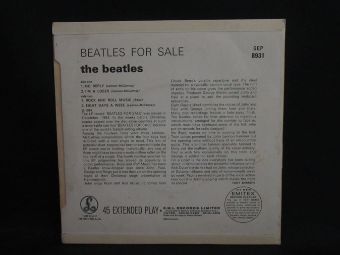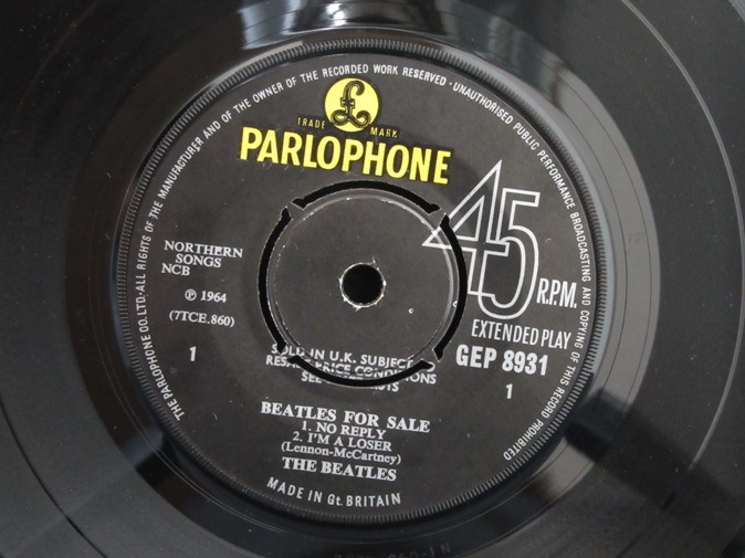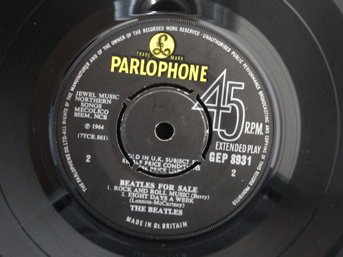 | ◆ EP BEATLES / Beatles For Sale (UK Y/B Parlophone) Ex/Ex- 8800円(内税) オリジナル折り返しジャケ。SOLD IN U.K.レーベル表示。プッシュアウトセンター。SOLD IN U.K. レーベル表示、リム沿いが「PARLOPHONE CO LTD...」で始まり、マトリックス両面1のファーストプレス。メタルマザー、スタンパーは KT5 RR/KT2 L です。黒地に黒字のため大変分かりずらいですが、レーベルB面に名前の書き込みがあります。マトリックスは 860-1N,861-1N です。PIC1 PIC2 PIC3 PIC4 | |