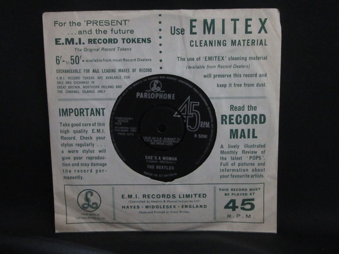 | ◆ 45 BEATLES / I Feel Fine/She's A Woman (UK Parlophone) -/M- 12000円(内税) プッシュアウトセンター。SOLD IN U.K.レーベル表示。レーベルリム沿い PARLOPHONE CO LTD 表示。Recording First Published 1964 レーベル表示。ファーストプレス。カンパニースリーブ付き。ニアミント品。センターの隙間が大きい Oriole プレス。大変レアです。極美品。メタルマザー、スタンパーは KT 記載無/ KT 記載無 です。マトリックスは 18171-1N,18172-1N です。PIC1 PIC2 PIC3 PIC4 | |
